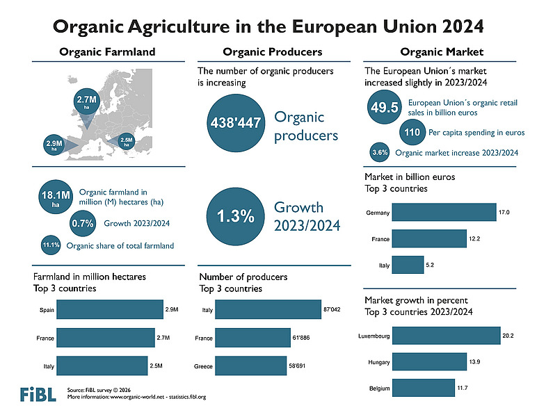 Daugiau apie europinę statistiką ir tendencijas čia https://www.fibl.org/en/info-centre/news/europes-organic-market-sets-another-record-in-2024-farmland-stable